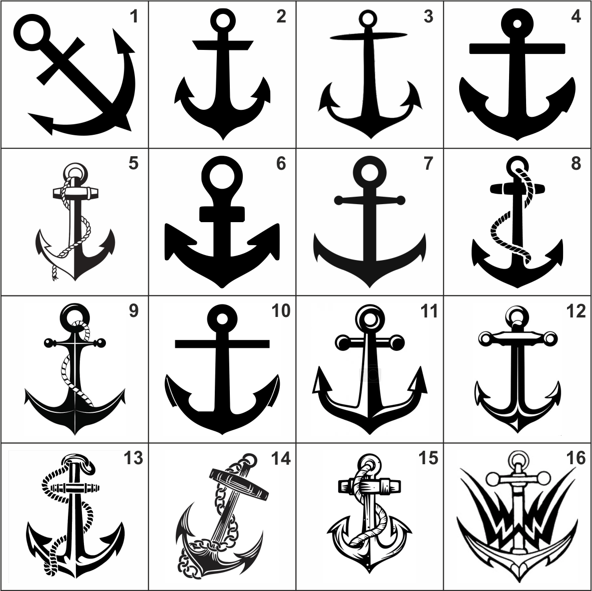 Вы можете выбрать любой из 16 вариантов наклейки якорь, доступных для заказа.